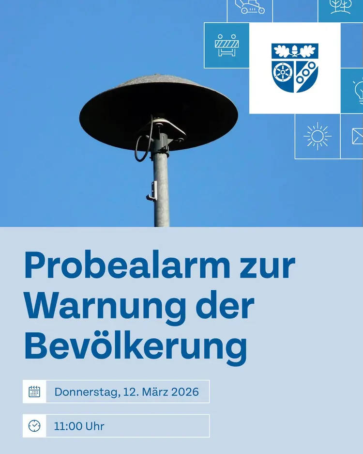 Zur Überprüfung der Funktionsfähigkeit und zur Information der Bevölkerung wird am Donnerstag, den 12. März 2026 um 11:00 Uhr eine Probealarmierung durchgeführt. Hierfür werden die Sirenen mit dem Sirenensignal „Warnung der Bevölkerung“ - einem einminütigen Heulton - ausgelöst. Beim Ertönen des Heultons ist das Radio einzuschalten und auf Durchsagen zu achten.