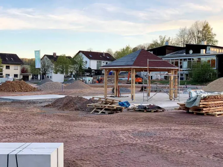 Die Arbeiten am Sport- und Freizeitgelände gehen voran. Der barrierefreie Zugang zum Gelände von der Dörnsteinbacher Straße ist nahezu hergestellt, der Untergrund für den Bolzplatz ist vorbereitet, das Basketballfeld ist asphaltiert, der große Pavillon steht, der große Sandspielbereich ist hergestellt und ein Seilbahnhügel ist bereits angeschüttet.