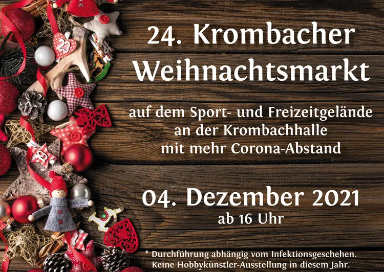Die Gemeinde und die Ortsvereine möchten in diesem Jahr den 24. Krombacher Weihnachtsmarkt am 04. Dezember ausrichten. Corona-bedingt soll der Weihnachtsmarkt auf dem neuen Freizeitgelände an der Krombachhalle stattfinden. Dort steht eine größere Fläche zur Verfügung und die erforderlichen Corona-Abstände können gut einhalten werden. Das komplette Programm wird in den nächsten Tagen veröffentlicht.